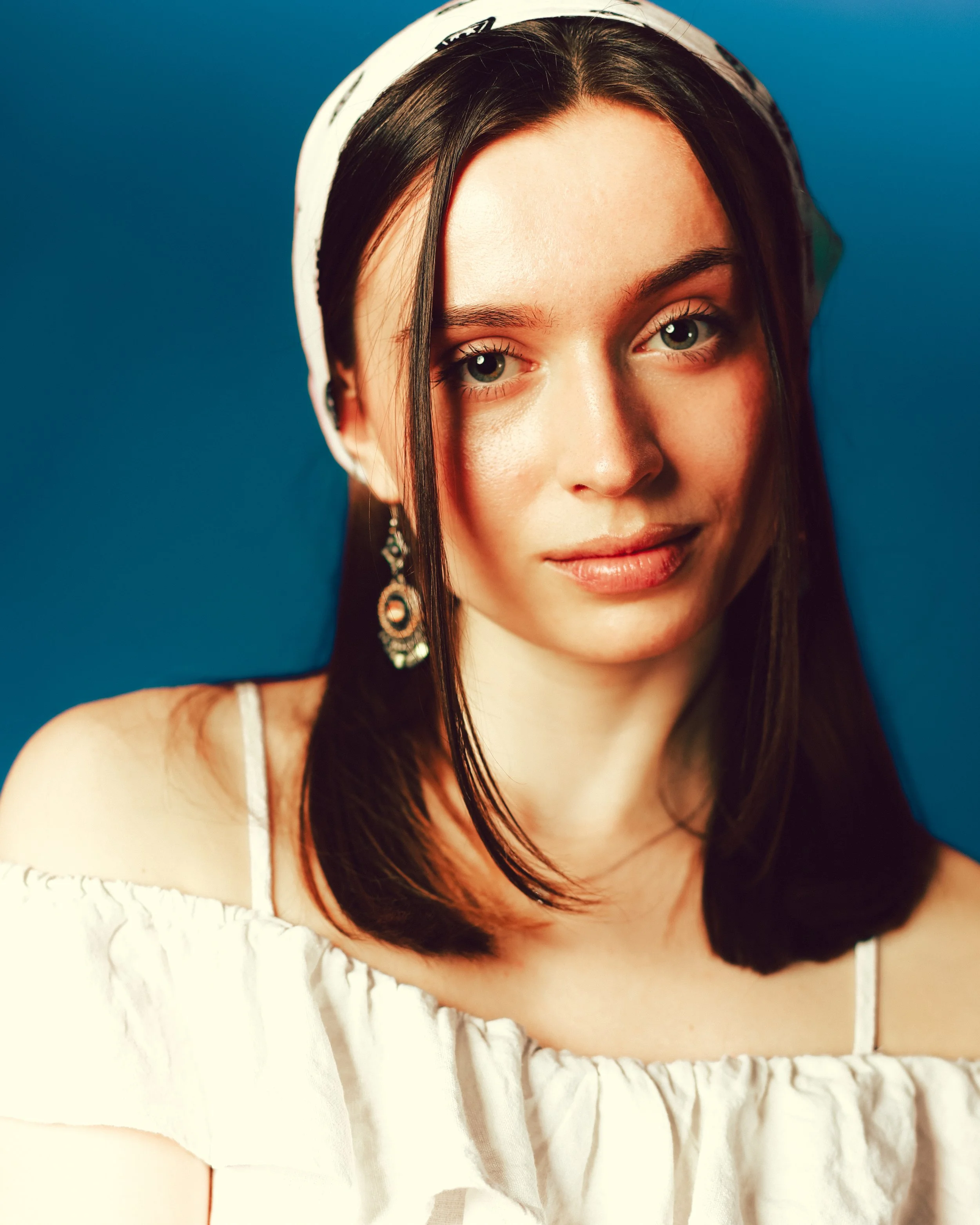 Close-up portrait of a young woman with dark hair, light skin, and blue eyes, wearing a white off-shoulder top and decorative earrings, against a dark blue background.